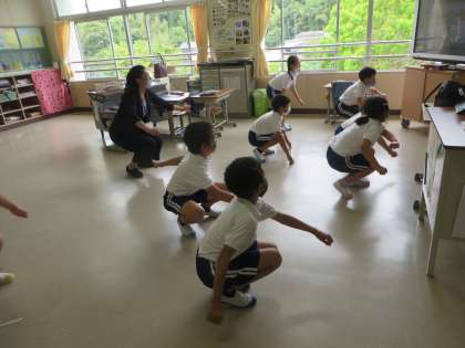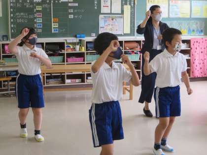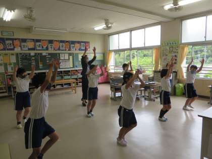 英語でダンス 4年生 公開日 2021/06/02 更新日 2021/06/02 お知らせ 校長室に4年生の子どもたちが訪ねてきて、「英語の授業でダンスをするので、一緒にきてください。」と英語で誘ってくれました。「Cha Cha」という曲を一緒に踊りました。子どもたちはノリノリで、とても楽しんでいました。画面の中に英語で「turn left」等動きの指示が、字と言葉で出てくるので、それを聞いて動いていました。 4年