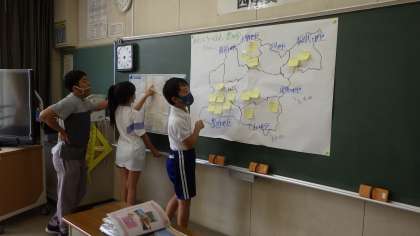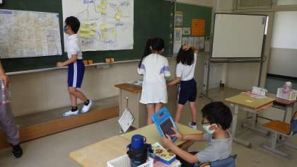 わたしたちの住む豊田市 3年生 公開日 2021/06/16 更新日 2021/06/16 お知らせ 3年生の社会「わたしたちのすむ豊田市」の学習です。付箋に発見したことを書き、黒板に貼った豊田市の地図に貼り、「発見地図」を作っていました。図書館に置いてあるパンフレットやリーフレットを集めたファイルから必要な物を選んで読んだり、タブレットで調べたりしているそうです。 3年