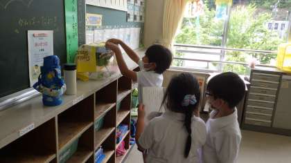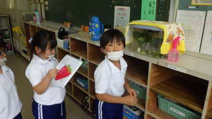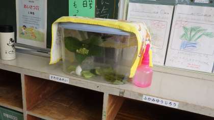 カタツムリ 1年生 公開日 2021/06/21 更新日 2021/06/21 お知らせ 帰りの会の前の、帰りじたくをする時間、1年生の教室をのぞきました。教室の後に観察ケースが置いてあり、中にカタツムリが飼われていました。1年生の子が霧吹きで水をかけ、湿らせていました。 アジサイの花や、えさのキャベツ、卵のからなどが入っていました。えさになる物や飼い方は本で調べたようです。しっかりお世話をして、かわいがっています。 1年