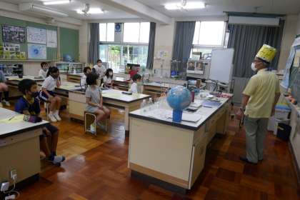 6月22日(火)、愛知県の地球温暖化防止活動推進委員による出前授業「ストップ温暖化教室」を3,4年生が受けました。様々な実験を用意してくださり、それらを見せながら、話をしてくださいました。子どもたちはよく反応しながら話を聞いていました。「地球は年々暑くなっている。それは二酸化炭素が増えているから。」「人が物を燃やすから。二酸化炭素が増えている。特に火力発電で二酸化炭素が発生する。」等について知識を深め「人間のせいで温暖化が進んでいるから、人間が何とかしなくては。」等の感想をもちました。