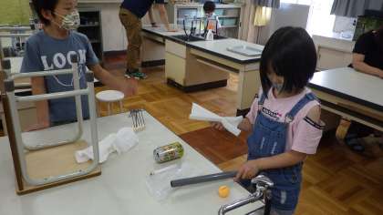 エコ大臣にチャレンジ 公開日 2021/06/23 更新日 2021/06/23 お知らせ 「ストップ温暖化教室」をやってくださった地球温暖化防止活動推進委員の方(エコ大臣)が、お楽しみのゲームを用意してくださり、チャレンジしたい子どもたちが休み時間に取り組みました。 「1本の釘でたくさんの釘をひきあげることができるか」のゲームや、静電気で物を動かすゲームを楽しみました。