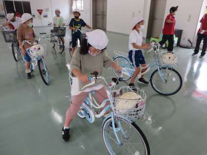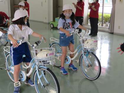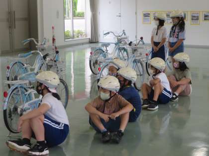 7月8日(木)、4年生が交通安全学習センターに出かけ、交通安全教室に参加しました。はじめにシアターで認知ゲームを行いました。次に、ホールで、自転車の点検や乗り方・止まり方の指導を受け、自転車の練習をしました。雨が降っていたので外のコースは走れませんでしたが、中金小学校の8名だけで広いところを使わせていただき、交通安全学習センターの方も1対1で教えていただけるほど手厚くしてくださいました。