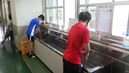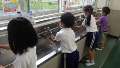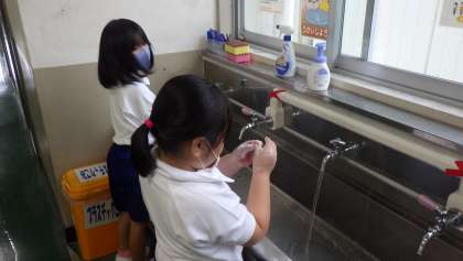 丁寧に手洗い 公開日 2021/09/02 更新日 2021/09/02 お知らせ 青空タイムが終わり、子どもたちが教室に戻ってきたときの様子です。声をかけなくても教室へ入る前に手洗い場へ向かう子がほとんどでした。子どもたちは、手洗い場にある泡の石けんを使って、丁寧に手を洗っていました。「上手に洗えるね。」と低学年の子どもに声をかけました。 活動の前後、トイレや精巣の後、しっかり手を洗えるよう、担任とともに声をかけていきます。