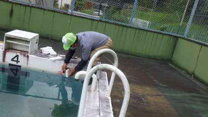 夏休みの最終日にもハチの巣を駆除してくださいましたが、今日も2つの巣を発見し、駆除をしてくださいました。ハチが巣を作っていたプールの飛び込み台のところの穴を、発泡スチロールでふさいで、ハチが入れないようにしてくださいました。また、ビワの木の肥料やりもしてくださいました。いつもありがとうございます。