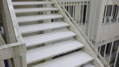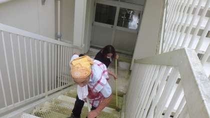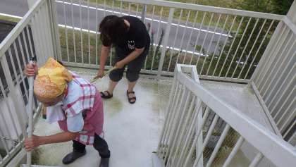 非常階段の掃除 公開日 2021/09/16 更新日 2021/09/16 お知らせ 今年は雨が多かったためか、外の非常階段に藻がはってしまいました。非常時、子どもたちが滑っては危ないので、職員で掃除をすることにしました。上から水を流しながら、モップでごしごし。水と汗でべとべとになりながら、藻を取り除きました。緑色だった非常階段が、写真のように白く美しく蘇りました。