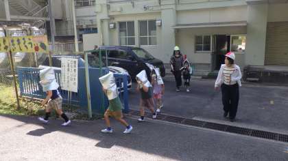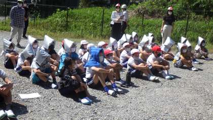 避難訓練は、いつ訓練をするかを事前に知らせず、休み時間に放送を入れ、いきなり訓練に入る形で行いました。休み時間ですので、外に出て遊んだり、教室にいたり、図書室に向かっていたり…まちまちの場所で、放送を聞いて動かなくてはいけません。安全な場所で体を低くし、頭を守るシェイクアウトの格好をし、それから避難しました。頭を保護しながら「お・は・し・も」の約束を守り、すばやく非難をすることができました。