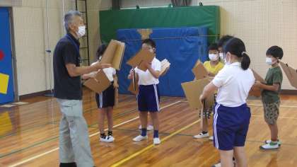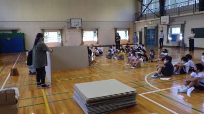 避難訓練のあとは体育館に移動して、防災に関する学習です。豊田市生涯学習出前講座を活用して、豊田市防災対策課の方々に教えていただきながら「段ボールの避難所づくり体験」を行いました。