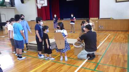 話をしっかり聞き、2つのチームに分かれ、段ボールを運び、避難所を作りました。
