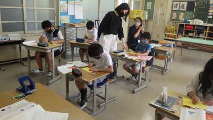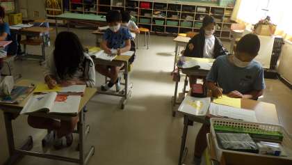5年生の国語の授業です。「注文の多い料理店」のおもしろさについて、ポップ風の解説書を書く学習です。「注文の多い料理店」の様々な場面で二つの意味があることを読み解いてきたので、そこに着目して書いたものが多くありました。自分で書いた後、ペアの友達と読み合い、見直しをして清書を書き始めました。