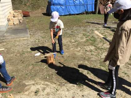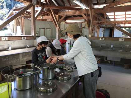 かまど係は、ナタを使って薪割りをしました。食事係はカレーとご飯、水を鍋に入れました。