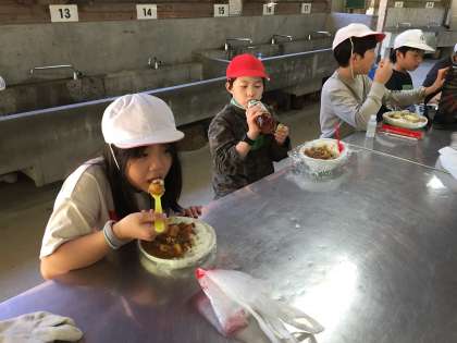 どの班も「いただきます。」美味しいカレーに、にこにこ笑顔です。感染症対策で食べながらのおしゃべりはできませんが、カレーを味わった後は、片付けに入るまで、マスクをつけておしゃべりを楽しみました。