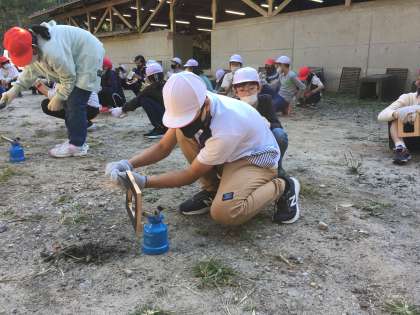 バーナーで木の枠を焼いて、磨き、写真たてを作っています。紐をつけたり、絵を描いたりするのは後日、学校で行います。