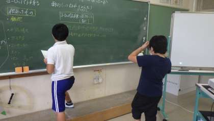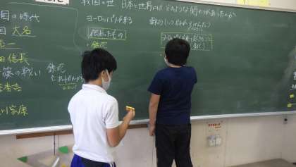 6年生の社会科「戦国時代」の学習です。ヨーロッパ人が来航して日本に伝わった物について調べたことを黒板に書き、発表をしました。また、ヨーロッパの進んだ文化や品物が入ってきたことで、どのような影響があったかを考えました。