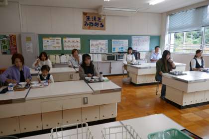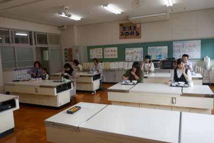 例年は、教室で、子どもたちと一緒に食べていただいていますが、新型コロナ対策として、家庭科室で保護者のみで行いました。子どもたちと同様、「前向き」「沈黙」です。食べ終わってからアンケートを書いていただきました。「給食は栄養を考えて作られているのでありがたい。」「献立の参考になった。」「配膳の様子も分かってよかった。」等のご意見がありました。