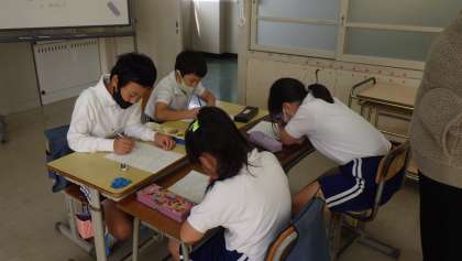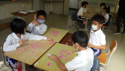 ゲームは15分行い、答えの発表をしたあとは、最初に示した観点に沿って振り返りをしました。「手振り、身振りで一生懸命伝え、お互いに分ろうとして、よく通じたところがよかった。」「〇〇さんが、自分には思いつかない言葉を考えていたから、すごいと思った。」等の感想を書いていました。コミュニケーションを積極的にとって協力することや、仲間のよいところ見つけをすることを学びました。
