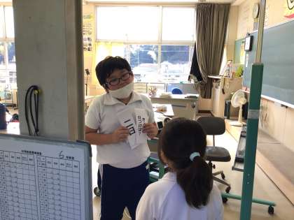 自分で覚えたと思ったら、まず担任に聞いてもらい、オッケーなら、6年生に聞いてもらいます。最後は校長室に行って、校長がテストをします。校長がクリアできたら、「ひまわりシール」がもらえます。担任がチェックカードを作ったので、そこに担任・6年生・校長のサインやシールを貼ってもらうことを楽しみに、子どもたちががんばっています。