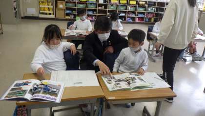 1年生は「ここに、このことをまとめて書くんだよ。」と説明したり、教育長の胸のバッジを見て「あ、虹色のバッジ。パイナップルみたいな形。」と楽しくお話をしたりしました。