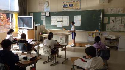4年生の算数では、教科書の復習問題を解き、答え合わせをしていました。ホワイトボードに考え方を書き、順番に説明をしながら答え合わせをしました。いつもそのやり方をしているので、説明が上手になってきました。