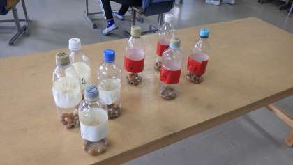 運動会を盛り上げるために、6年生の発案で4年生が全校分のマラカスを作ってくれました。ちょうど4年生がどんぐりを集めていたので、それをペットボトルに入れて作りました。応援の声を出せないので、マラカスや拍手で応援をします。