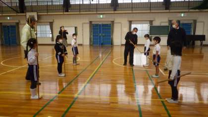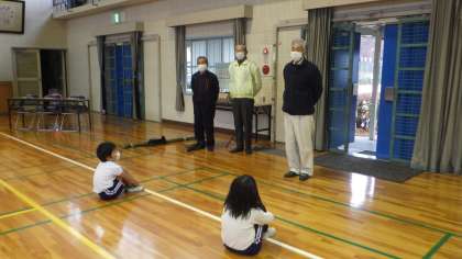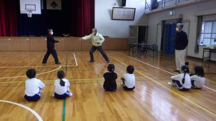 中金小学校の学区には「石野歌舞伎」「棒の手」の2つの郷土芸能があります。今年度から、ふるさと学習に取り入れることにしました。石野歌舞伎は5,6年生が取り組み、7月に発表をしました。棒の手は2年生が取り組みます。地域の講師が3名来てくださり、5、6回練習をしていきます。