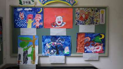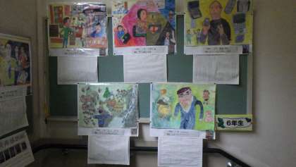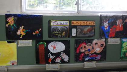 階段の踊り場に、読書感想画が掲示されました。どの学年も図工の時間に一生懸命取り組みました。絵だけでなく、その本を読んだ感想もしっかり書いてありました。