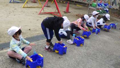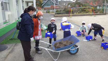 1年生がチューリップの球根を植えました。植え方を公務手の二人に教えていただき、好きな色の球根を選んで植えます。春に咲くのが楽しみですね。新しい1年生をこのチューリップとともにお迎えする日のために、お世話をしていきます。