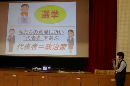 11月26日(金)、豊田市選挙管理委員会による「選挙出前トーク」の授業を、5・6年生が受けました。この「選挙出前トーク」は、選挙がどういうものかを体験的に学ぶものです。