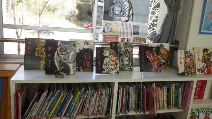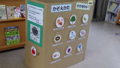 窓際には、滝平二郎さんが挿絵を描いた絵本のコーナーが設置されていました。また、「モノのかぞえ方えほん」の紹介とともに、ものの数え方をクイズのように楽しめるように段ボールで作った展示がありました。「本当は横にスライドして答えを見てほしいけど、子どもたちはみんなめくっていくんですよ。」と司書さん談。