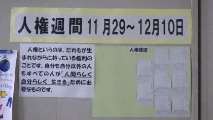 人権週間の取組の一つとして、人権に関連する標語を募集しています。係の先生のところに少しずつ作品が届いているのですが、それを目に見える形にしたいと、小さめにコピーした作品を掲示していました。