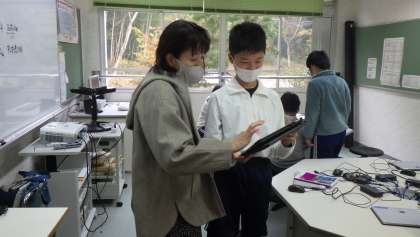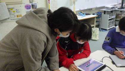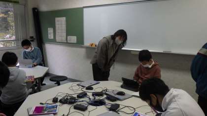 5年生のプログラミングの授業の様子です。スクラッチを使って、クリッカーゲームを作る活動をしました。子どもたちは集中して取り組み、チュートリアル(プログラムの説明書)を見ながら、色を変えたり、音を鳴らしたりするプログラムを作りました。今日はICT支援員が授業の補助をしました。