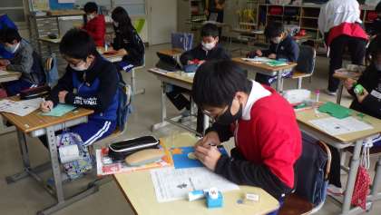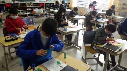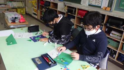 クリスマスカードづくり 公開日 2021/12/08 更新日 2021/12/08 お知らせ ALTと一緒にクリスマスカードを作っているところです。色の紙をパンチングしたり、クリスマスっぽい包装紙の絵を切り抜いたりして貼り、思い思いのカードを楽しんで作りました。英語のメッセージも書き込みました。 3年 4年 5年 6年