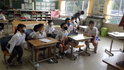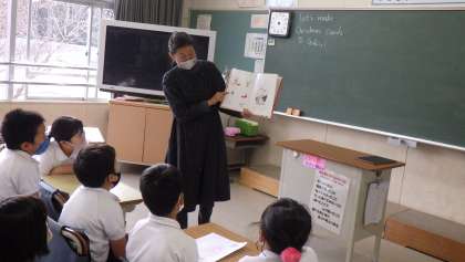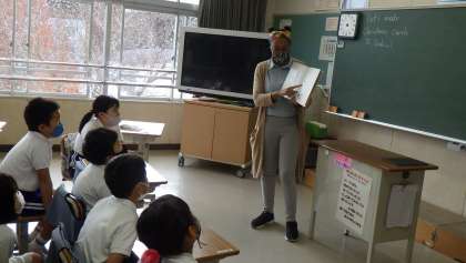 クリスマスカード作りに入る前に、絵本の読み聞かせを聞きました。「オリビア クリスマスのお手伝い」(イアン・ファルコナー作 あすなろ書房)の英語版と日本語版を読みました。図書館司書が日本語版の読み聞かせをしたあと、英語版をALTが読みました。同じ話なので、英語版もストーリーが分かり、子どもたちは知っている単語を繰り返し口に出して楽しんでいました。