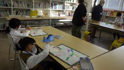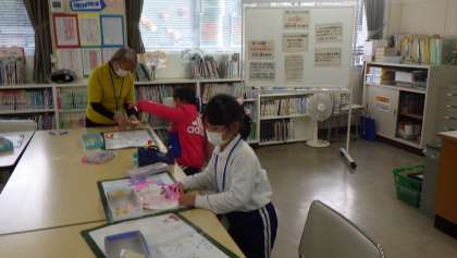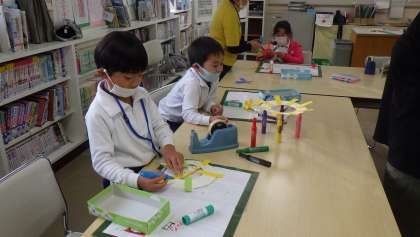 水曜日、まちかど図書館です。今月の工作は「クリスマスリース」 図書館ボランティアの方が用意して下さった部品を使い、こども園の子でも作れるようになっています。1年生も一緒に行っていますが、飾りを工夫し、個性あふれる工作となりました。