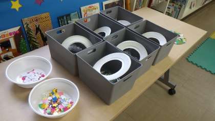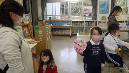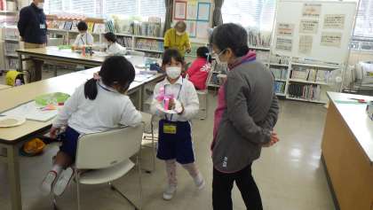 3枚目の写真は、こども園の子用にセットした材料です。今日は3人の子どもとその保護者がまちかど図書館を訪れました。