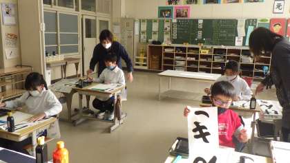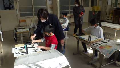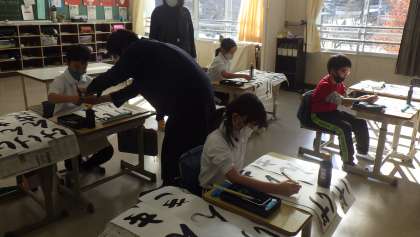 書き初め指導補助ボランティア 公開日 2021/12/13 更新日 2021/12/13 お知らせ 12月13日(月)、書道の先生が「書き初め指導補助ボランティア」として来校され、子どもたちに指導してくださいました。これは豊田市文化振興財団が、希望する学校に豊田書道連盟の会員(書道の先生)を派遣してくださるものです。