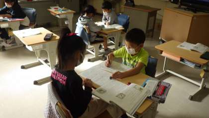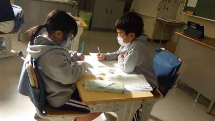 2年生の国語の学習です。教科書の物語教材を使って「お手紙」を読み、同じような言葉が何度も出てくることに気付き、そのときの登場人物の気持ちを考えるためにプリントにまとめていました。今後、友情をテーマにした本を読んで、おすすめの本を紹介しあう活動へとつないでいきます。