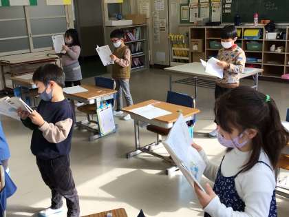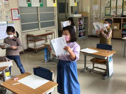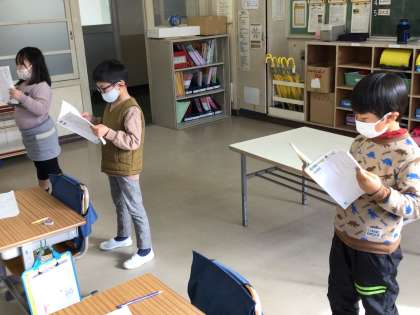 声に出して読もう 1年生 公開日 2021/12/17 更新日 2021/12/17 お知らせ 1年生の国語の授業風景です。教科書教材「おとうとねずみのチロ」を音読していました。良い姿勢ではきはきと読んでいました。チロの気持ちを考え、気持ちがよく伝わるように読めるよう、学習を進めていきます。 1年