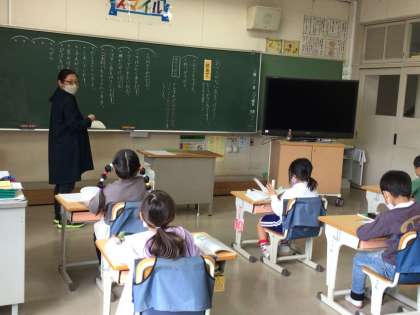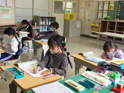 2年生の国語「送りがなに気をつけて書こう」の学習です。同じ漢字でも送りがなが違う例を挙げて一緒に考えた後、黒板に書かれた文を送りがなに気をつけて、真剣な表情でノートに書いていました。黒板を写すスピードも速くなってきました。