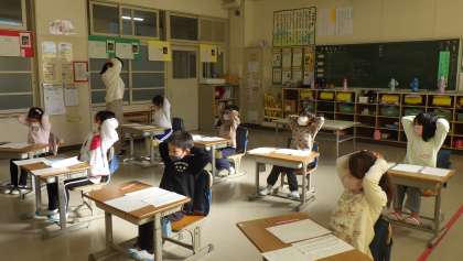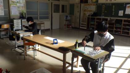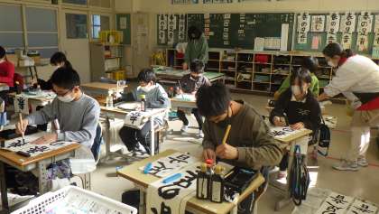 書き初め大会 その2 公開日 2022/01/07 更新日 2022/01/07 お知らせ 子どもたちは集中して字を書いていました。字を書くのに疲れると、手首を回したり、伸びをしたりする「書写体操」(写真1枚目)を行っている学年もありました。 冬休みにも練習した「書き初め」。納得のいく字が書けたようです。