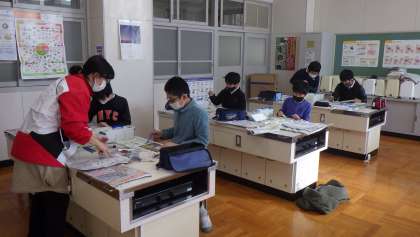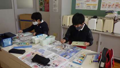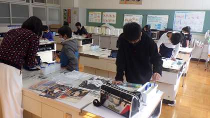 5・6年生の図工「つなげよう 石野歌舞伎 役者絵展」の授業風景です。役者絵の版画に、紙の裏から彩色をしているところです。子どもたちは、塗り方に気をつけて、肌の色などを入れていました。作品がさらに生き生きとしてきました。