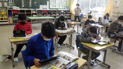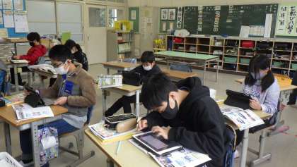 5年制の社会科の授業風景です。「日本の自動車づくりのよさをまとめよう」という学習で、教科書をもとに、タブレットのスカイメニューでまとめをしていました。日本の自動車づくりのよさについて気づいたことの中から、発表したいことを決め、写真と説明、感想を書きこみました。次回は発表をしていきます。