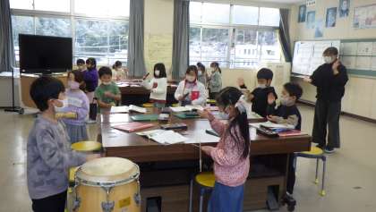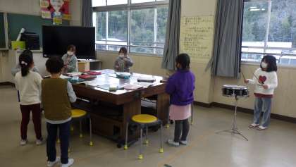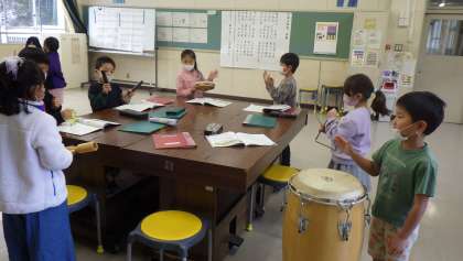 1・2年生の音楽「いろいろな楽器の音をさがそう」の学習です。今日は様々な種類の楽器を使って、「かぼちゃ」という曲を表現しました。「かぼちゃ」の歌を歌いながら、楽器の音を加えていきました。一番が終わると、次の二番は時計回りに場所を移動して、楽器を交代しながら何度も演奏しました。