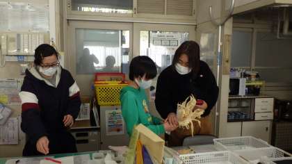 まなびルームが栽培したポッポコーン用のとうもろこし。職員室の先生をお客さんにして販売のやり取りをしました。挨拶、商品の説明、お金のやり取り、おつりの計算を一生懸命行いました。ポップコーンの作り方を書いた紙もくれました。親切なとうもろこし屋さんです。
