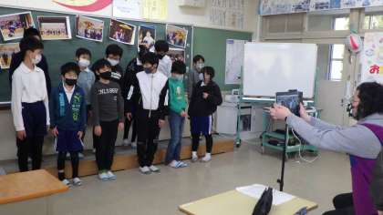 学習発表の動画撮影をしています。5・6年生は夏に練習を重ねて発表をした石野歌舞伎について、体験したことや調べたことについて発表します。
