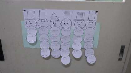 先週から「スノーマン図書館まつり」。図書委員のアイデアを生かした活動をしています。その一つ、期間中に読んだ本の名前を書いて、雪だるまの胴体に貼っていく掲示物です。読むほどに胴体が増えていきます。写真は2年生の掲示です。どの子も本を読んでいますね。どこまで増えるのかな。