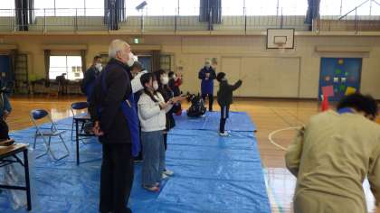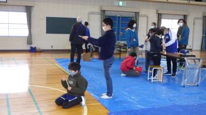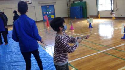 ものづくり出前授業 5,6年生 その2 公開日 2022/01/26 更新日 2022/01/26 お知らせ 竹の空気でっぽうが出来上がったら、玉をこめて打ってみました。新聞紙を濡らして硬く詰め、押し出します。ポン!と勢いよく飛ぶと「やったあ」と嬉しそうでした。以前、理科で学習した「空気」の学習を思い出して「もっとたくさん詰めるといいよ。」「それじゃあ空気がもれるよ。」等と話しながら楽しんでいました。ものづくりサポーターの皆様、ありがとうございました。 5年 6年