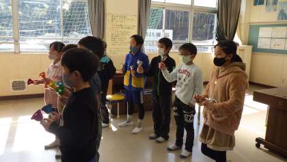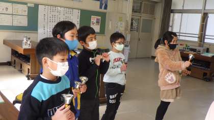 ハンドベル 3,4年生 公開日 2022/02/08 更新日 2022/02/08 お知らせ 3,4年生が、音楽でハンドベルの演奏をしていました。ハンドベルは自分の担当する音をリズムに合わせて出していくので、かなり集中力が必要です。 「エーデルワイス」という曲を練習し、授業の最後には、伴奏だけのCDをバックに、リズムよく演奏することができました。 3年 4年
