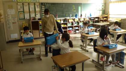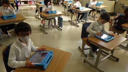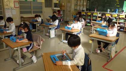 1,2年生が、生活科でプログラミング学習を行いました。ビスケットというアプリを使って、自分の描いた絵を動かし、ゲームを作りました。自分の考えた生き物が卵から生まれ、UFOと重なったら変化するというプログラムを組みました。子どもたちは「UFOと生き物がぴったり重なるためには、まっすぐに動かした方がいいみたいだよ。」「UFOと当たったら爆発するのではなく、UFOに捕らえられるというように作り替えようかな。」等と話しながら、いろいろ試していました。