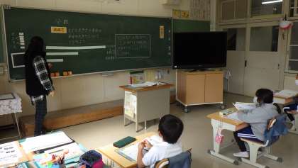 2年生の算数「分数」の学習です。色画用紙を使って線分図にして示し、「何分の1」の意味を学習しました。