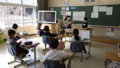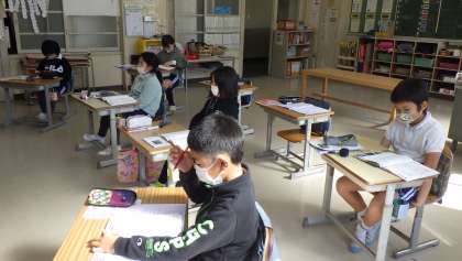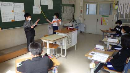 4年生の算数「変わり方」の学習です。練習問題に取り組み、ホワイトボードに書きこみました。それを見せながら、ペアで説明をしています。